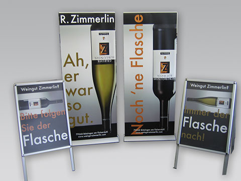 Roll Up Banner oder Leinwände. Wir nutzen ausschließlich UV-beständige und für den Außenbereich geeignete Tinte.